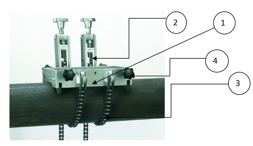 3. Place the tube clamp device on the pipe then hookup the sprocket chain (3) to the base.